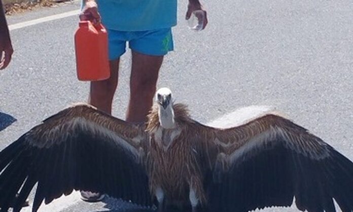 Το περιστατικό συνέβη στα Λινοπεράματα, λίγο πριν την Αγία Μαρίνα, στον ΒΟΑΚ. Το πτηνό ήταν πολύ αδύναμο λόγω του καύσωνα, ενώ κινδύνευε να παρασυρθεί από τα διερχόμενα οχήματα. Αμέσως, κάποιοι σταμάτησαν στην άκρη του δρόμου και έσπευσαν να του δώσουν νερό.