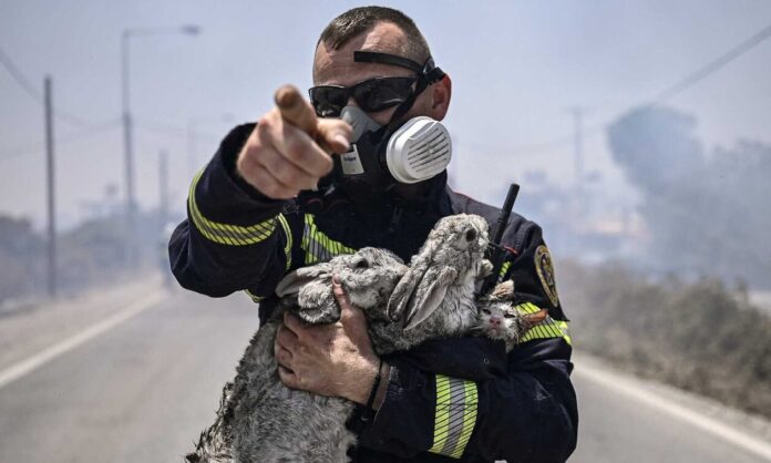 Ο πυροσβέστης κρατάει σφιχτά στην αγκαλιά του τα ζωάκια και τα απομακρύνει σώα από την πύρινη λαίλαπα