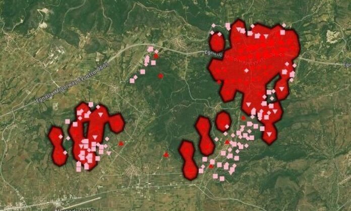 Η υπηρεσία διαχείρισης έκτακτης ανάγκης «Copernicus» παρουσιάζει δορυφορική εικόνα από τις καμένες εκτάσεις και τα ενεργά μέτωπα της πυρκαγιάς.