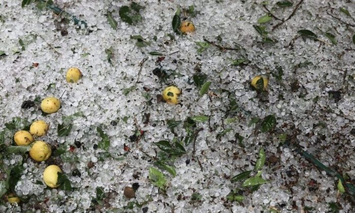 Πληγές μετρούν και πάλι οι Μηλοπαραγωγοί στο Μεσόβουνο, αφού το χοντρό χαλάζι και η δυνατή βροχή που έπεσαν για ένα τέταρτο περίπου, τόσο εντός όσο και περιμετρικά του οικισμού, διέλυσαν τη φετινή παραγωγή.
