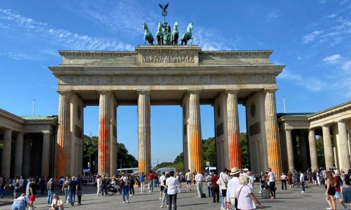 Σήμερα (17/09), μέρος της Πύλης του Βρανδεμβούργου, το εμβληματικό σημείο της πρωτεύουσας της Γερμανίας, βάφτηκε… πορτοκαλί έπειτα από επέμβαση της ομάδας ακτιβιστών «Τελευταία Γενιά».