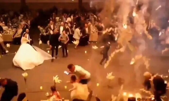 Ενώ το νιόπαντρο ζευγάρι χόρευε στο κέντρο της στολισμένης αίθουσας, «ξέσπασε» πυρκαγιά από τα πυροτεχνήματα που είχαν τοποθετηθεί περιμετρικά του κτηρίου. Τη στιγμή που η αίθουσα της δεξίωσης «τυλίγεται» στις φλόγες, ήταν γεμάτη με 900 καλεσμένους. Στο βίντεο που ακολουθεί, φαίνεται η «κόλαση» φωτιάς που προκλήθηκε από τα πυροτεχνήματα.