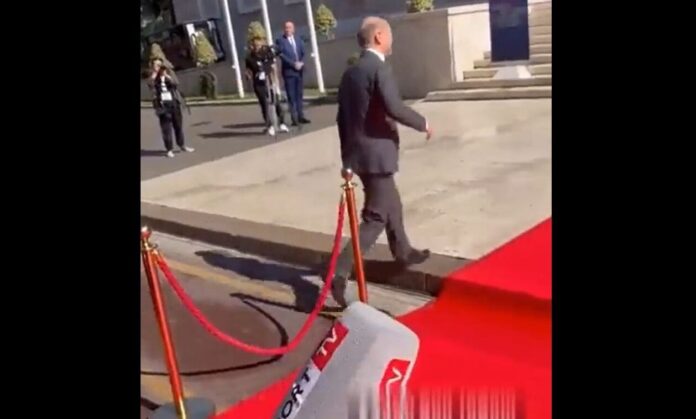 Κατά την άφιξή του στο πρωθυπουργικό γραφείο του Έντι Ράμα, ο Όλαφ Σολτς αντί να στρίψει και να ακολουθήσει το κόκκινο χαλί που του έδειχνε την πορεία για να συναντηθεί με τον οικοδεσπότη, συνέχισε ακάθεκτος τη διαδρομή του περνώντας πάνω από τα διαχωριστικά και άρχισε να προχωρά όπως φαίνεται και στο βίντεο.