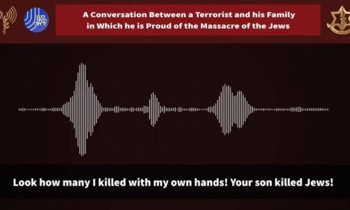 Οι Ένοπλες Δυνάμεις του Ισραήλ (IDF) δημοσιοποίησε ένα σοκαριστικό ηχητικό ντοκουμέντο, στο οποίο πιστεύεται ότι ακούγεται η συνομιλία ενός μαχητή της Χαμάς με τον με τον πατέρα του. Ο νεαρός καυχιέται ότι σκότωσε δένα ανθρώπους με τα ίδια του τα χέρια, προτρέποντας τον πατέρα του να ανοίξει την εφαρμογή WhatsApp, προκειμένου να δει τις φωτογραφίες που τού έστειλε από τις εκτελέσεις.