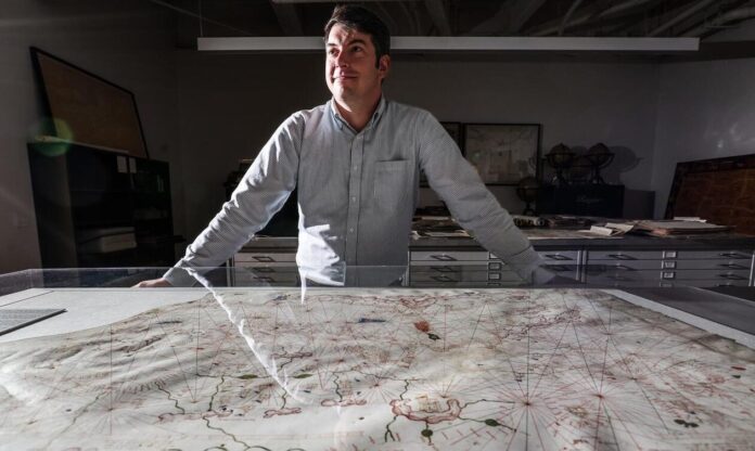 Σε εικονική περιήγηση του Christie’s για τη δημοπρασία που διοργάνωσε το ίδρυμα που διαχειρίζεται την περιουσία του κληρονόμου του μεγιστάνα του πετρελαίου Γκόρντον Γκέτι και της συζύγου του Αν, ο Άλεξ Κλάουζεν από τη Barry Lawrence Ruderman Antique Maps Inc παρατήρησε έναν παλιό ναυτικό χάρτη, γνωστό ως πορτολάνο.