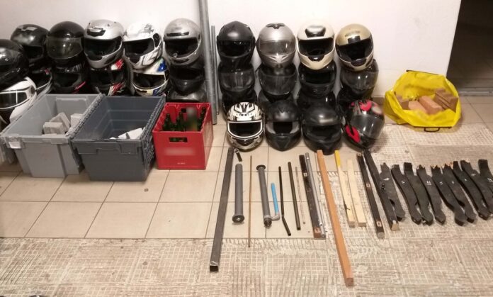 Αστυνομικοί που έφτασαν στο σημείο της συμπλοκής κατέσχεσαν 12 κράνη μοτοσικλέτας, πέντε σιδερόβεργες, οκτώ στειλιάρια, πυροσβεστήρα, σιδερένια αλυσίδα και μεταλλικό αντικείμενο.
