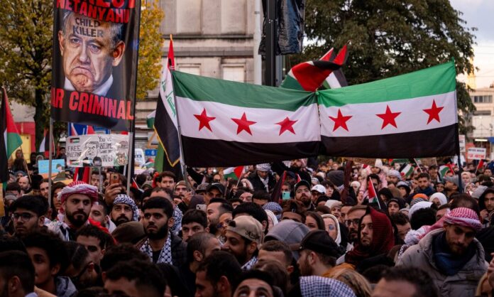 Πλήθος κόσμου κρατούσε σημαίες της Παλαιστίνης και φώναζε συνθήματα όπως «Η ιστορία έχει μια σωστή πλευρά, με την Παλαιστίνη ως τη λευτεριά».