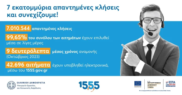 Πάνω  από 7 εκατομμύρια κλήσεις έχει εξυπηρετήσει στους 27 μήνες λειτουργίας του το 1555, ο Ενιαίος Αριθμός Εξυπηρέτησης Πολιτών του Υπουργείου Εργασίας και Κοινωνικής Ασφάλισης.