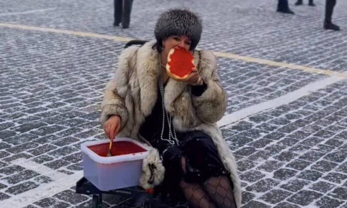 Η Gulina Naumann μαζί με μία φίλη της τράβηξαν βίντεο την ώρα που η 41χρονη καθόταν μπροστά στο Kρεμλίνο φορώντας ένα τεράστιο γούνινο καπέλο και έτρωγε ένα τεράστιο σάντουιτς με κουταλιές από κόκκινο χαβιάρι μέσα από ένα δοχείο 14 κιλών.
