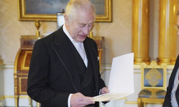 Σε αυτή ο βασιλιάς Κάρολος φοράει μια ρόμπα από μωβ μεταξωτό βελούδο κεντημένο σε χρυσό, το οποίο φορούσε ο βασιλιάς Γεώργιος VI το 1937.