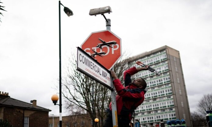 Το έργο τέχνης, μια κόκκινη πινακίδα stop με τρία στρατιωτικά drones εμφανίστηκε την περασμένη Παρασκευή στο Πέκαμ. Ο καλλιτέχνης επιβεβαίωσε ότι πρόκειται για έργο του και λίγες ώρες αργότερα η πινακίδα αφαιρέθηκε από έναν άνδρα. Η κλοπή έγινε μπροστά σε αυτόπτες μάρτυρες κάποιοι από τους οποίους κατέγραψαν το στιγμιότυπο. Το βίντεο έγινε viral, ενώ η αστυνομία ζητούσε πληροφορίες για το περιστατικό ή για το πού βρίσκεται η πινακίδα.