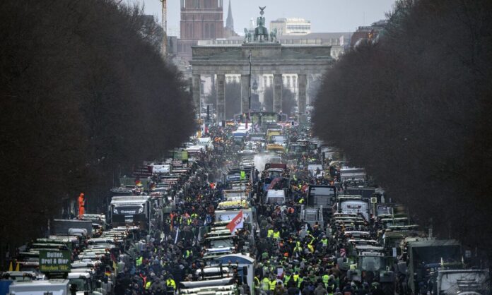 Περισσότεροι από 30.000 διαδηλωτές κατέκλυσαν χθες (16/1) το κέντρο του Βερολίνου ζητώντας από την κυβέρνηση να ανακαλέσει την απόφαση της για τη μείωση των γεωργικών επιδοτήσεων. Χιλιάδες αγρότες ανάμεσά τους εκπρόσωποι από άλλες βιομηχανίες, από την αλιεία μέχρι τη γαστρονομία απέκλεισαν τους δρόμους γύρω από την κυβέρνηση με τα οχήματά τους, συμπεριλαμβανομένων φορτηγών και περονοφόρων, ακόμη και με τρακτέρ-παιδικά παιχνίδια.