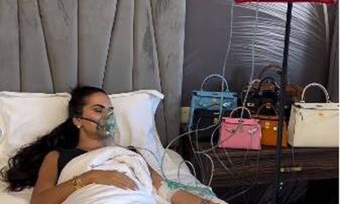 Στην ανάρτηση φαίνεται η ίδια στο κρεβάτι με μια μάσκα οξυγόνου και σωληνάκια που συνδέονται αντί για ορό σε πανάκριβες τσάντες