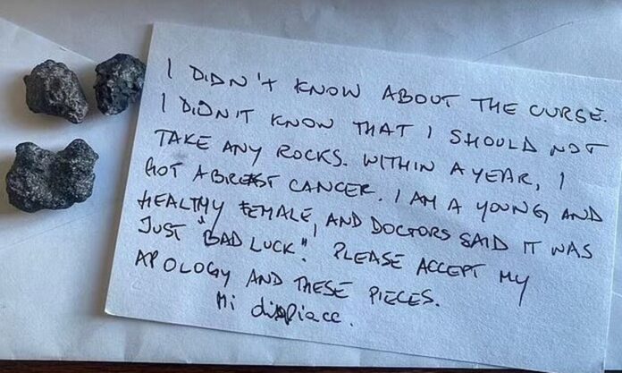 «Δεν ήξερα για την κατάρα. Δεν ήξερα ότι δεν έπρεπε να πάρω πέτρες» έγραψε η γυναίκα στην επιστολή της. «Μέσα σε ένα χρόνο, διαγνώστηκα με καρκίνο του μαστού. Είμαι μια νεαρή και υγιής γυναίκα και οι γιατροί είπαν ότι ήταν ‘απλά κακή τύχη’. Παρακαλώ δεχτείτε τη συγνώμη μου και αυτά τα κομμάτια» ανέφερε η τουρίστρια κλείνοντας με το «Λυπάμαι» στα ιταλικά.