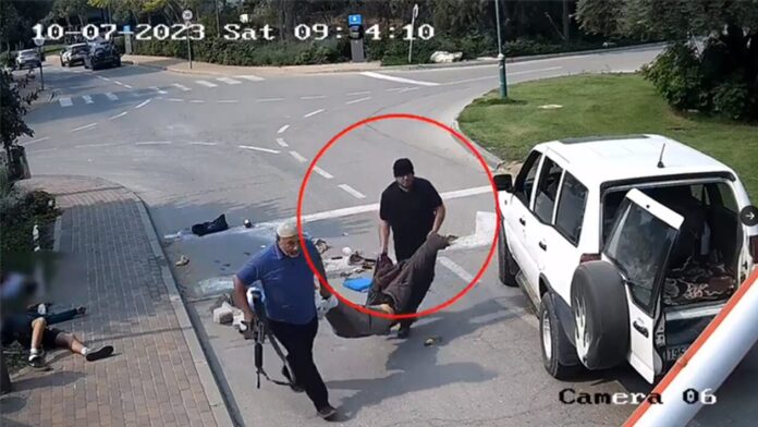 Kοινωνικός λειτουργός της υπηρεσίας των Ηνωμένων Εθνών για τους Παλαιστινίους (UNRWA), στη Λωρίδα της Γάζας φαίνεται σε βίντεο που έδωσαν στη δημοσιότητα ισραηλινοί αξιωματούχοι, να κουβαλά πτώμα Ισραηλινού άνδρα που δολοφονήθηκε κατά την επίθεση της Χαμάς στις 7 Οκτωβρίου να το βάζει μέσα στο πορτμπαγκάζ ενός οχήματος SUV και το όχημα να απομακρύνεται μετά από ένα χωριό του νότιου Ισραήλ.