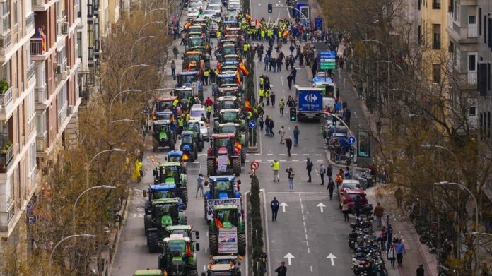 Χιλιάδες αγρότες από όλη την Ισπανία κατέβηκαν στους δρόμους της Μαδρίτης σε μια συναυλία από κόρνες, κουδούνια αγελάδων και τύμπανα, ανταποκρινόμενοι στο κάλεσμα της Ένωσης Συνδικάτων (Union de Uniones) αλλά και ομάδων αγροτών που κινητοποιήθηκαν στα μέσα κοινωνικής δικτύωσης.