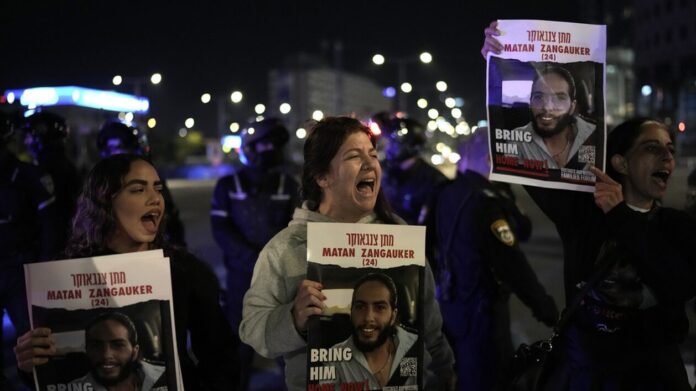 Οι διαδηλωτές πάνω απ’ όλα απαιτούν να κλείσει συμφωνία για την επιστροφή των ομήρων που κρατά η Χαμάς στη Λωρίδα της Γάζας.