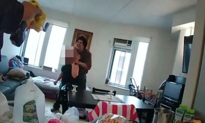 Ένα σοκαριστικό βίντεο που έδωσε στο φως της δημοσιότητας η αστυνομία της Νέα Υόρκης δείχνει την στιγμή που ένας αστυνομικός σκοτώνει έναν άνδρα που είχε εισβάλλει στο σπίτι της μητέρας του και την κρατούσε όμηρο. Το βίντεο που δόθηκε στη δημοσιότητα από το NYPD δείχνει τη στιγμή που ο αστυνομικός σκοτώνει έναν άνδρα με έναν πυροβολισμό. Ο ύποπτος κρατούσε τη μητέρα του σε ένα ασφυκτικό κλοιό, ενώ ούρλιαζε ότι είχε μαχαίρι μέσα σε ένα διαμέρισμα στο Μπρονξ τον περασμένο Δεκέμβριο.