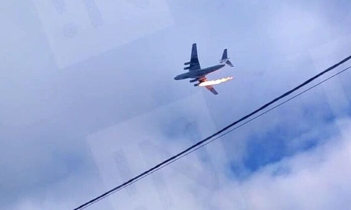 Πλάνα που κυκλοφορούν στα μέσα κοινωνικής δικτύωσης δείχνουν το αεροσκάφος IL-76 να κατεβαίνει προς το έδαφος με έναν από τους κινητήρες του να φλέγεται. Άλλα πλάνα έδειξαν μια στήλη μαύρου καπνού να υψώνεται από το σημείο της συντριβής.