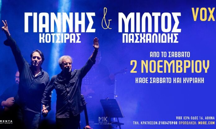 Ο Μίλτος Πασχαλίδης και ο Γιάννης Κότσιρας μετά από τις πολύ επιτυχημένες καλοκαιρινές τους συναυλίες επιστρέφουνε για 2η χρονιά στη σκηνή του VOX από το Σάββατο 02 Νοεμβρίου και κάθε Σάββατο & Κυριακή για λίγες παραστάσεις.