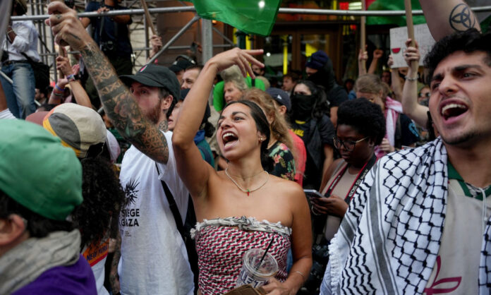 Χιλιάδες διαδηλωτές συγκεντρώθηκαν στην Τάιμς Σκουέρ της Νέας Υόρκης, κατά του Ισραήλ κρατώντας παλαιστινιακές σημαίες και πλακάτ με συνθήματα όπως «ελεύθερη παλαιστίνη», «σταματήστε τη λιμοκτονία στη γάζα» και «εμπάργκο όπλων τώρα». Πολλοί φορούσαν παλαιστινιακές μαντίλες, ενώ το πλήθος στη συνέχεια κατευθύνθηκε προς το κτίριο των Ηνωμένων Εθνών.