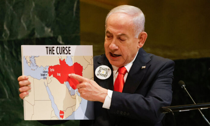 Στην αίθουσα της γενικής συνέλευσης του ΟΗΕ, χιλιάδες χιλιόμετρα από τις βομβαρδισμένες συνοικίες της Γάζας, ο Μπέντζαμιν Νετανιάχου συμμετείχε σε κάτι που έμοιαζε περισσότερο με επιχείρηση ψυχολογικού πολέμου παρά με ομιλία ενός πολιτικού ηγέτη. Τον τόνο έδινε ξεκάθαρα μια μεγάλη καρφίτσα στο πέτο του – ένας κώδικα qr – τον οποίο κάλεσε τον κόσμο να σκανάρει με τα κινητά του προκειμένου να δει εικόνες αίματος και θανάτου από την εισβολή της Χαμάς στο Ισραήλ την 7η Οκτωβρίου.