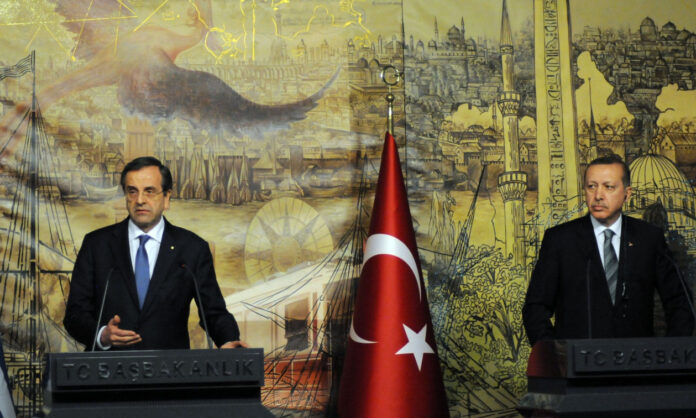Στιγμιότυπο από την συνάντηση που είχαν στις 4 Μαρτίου 2013 στην Κωνσταντινούπολη, οι τότε πρωθυπουργοί Ελλάδας και Τουρκίας Αντώνης Σαμαράς και Ταγίπ Ερντογάν, λίγες ημέρες μετά τη ρηματική διακοίνωση της Ελλάδας στον ΟΗΕ σχετικά με την υφαλοκρηπίδα και τις έρευνες για υδρογονάνθρακες στο Αιγαίο