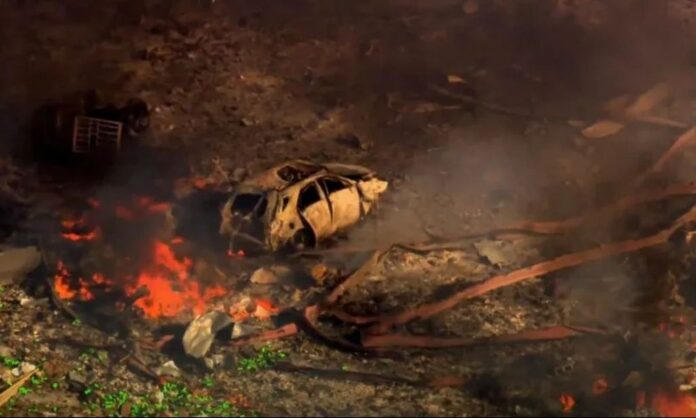 Αεροφωτογραφίες από το σημείο αποκαλύπτουν φωτιά και καπνό στην εγκατάσταση που βρίσκεται στην κορυφή ενός λόφου, ενώ συντρίμμια έχουν σκορπιστεί σε ακτίνα τουλάχιστον μισού μιλίου