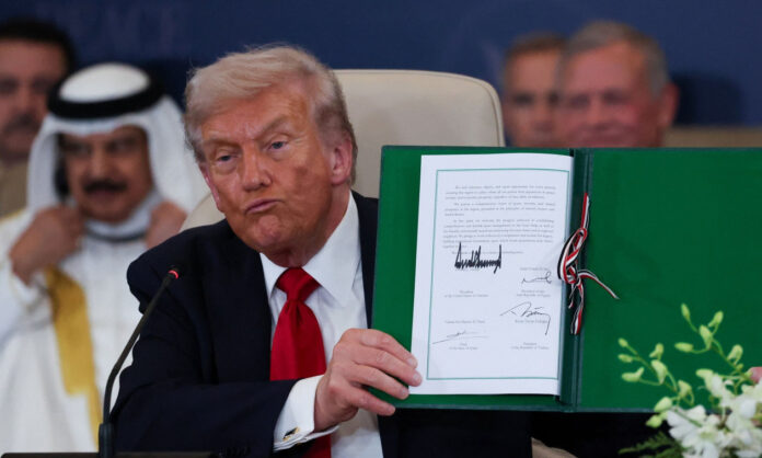 Το μεγαλύτερο μέρος της συνόδου κορυφής περιελάμβανε τον Τραμπ να επαινεί με ενθουσιασμό τους άλλους παγκόσμιους ηγέτες που ήταν παρόντες. Ο Αμερικανός πρόεδρος υπέγραψε ένα έγγραφο σε ένα τραπέζι μαζί με τους ηγέτες των τριών άλλων χωρών που μεσολάβησαν: Αίγυπτος, Κατάρ και Τουρκία. Πριν υπογράψει το έγγραφο, ο Τραμπ δήλωσε ότι «θα διευκρινίσει πολλούς κανόνες και κανονισμούς και πολλά άλλα πράγματα», είπε. «Είναι πολύ περιεκτικό».