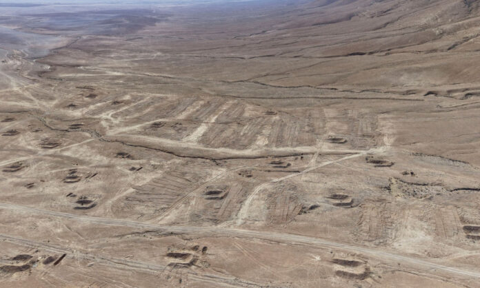 Τα αποτυπώματα, που δημιουργήθηκαν από ίχνη μπουλντόζας, στο έδαφος στην πόλη Ντουμαίρ. Έρευνα του Reuters διαπίστωσε ότι η κυβέρνηση Άσαντ μετέφερε κρυφά χιλιάδες πτώματα εδώ από έναν εκτεθειμένο ομαδικό τάφο στο προάστιο Κουτάιφα της Δαμασκού από το 2019 έως το 2021.