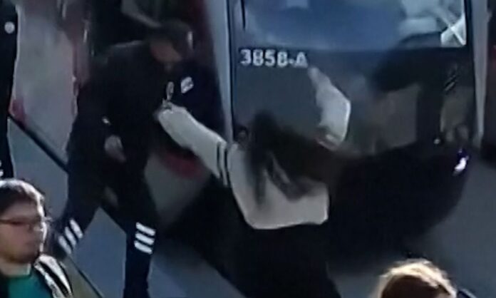 Όπως φαίνεται στο βίντεο που έχει γίνει viral, ο άντρας συνειδητοποιεί την απρόσεκτη κίνηση της κοπέλας να πάει προς τις γραμμές και απλώνει το χέρι του να την τραβήξει.