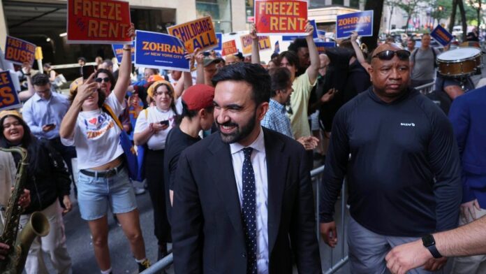 ψΜια αφίσα της προεκλογικής εκστρατείας του υποψηφίου δημάρχου των Δημοκρατικών, Zohran Mamdani, έξω από ένα κατάστημα, την Πέμπτη 26 Ιουνίου 2025, στη Νέα Υόρκη