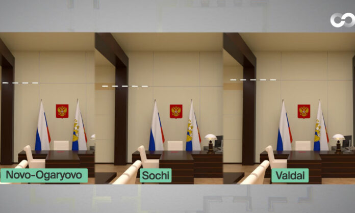 Σύμφωνα με έρευνα της Systema, η οποία ανέλυσε οπτικό υλικό για να φτάσει στα συμπεράσματά της, ο Ρώσος πρόεδρος έχει δημιουργήσει τρία αντίγραφα του επίσημου γραφείου του ανά τη χώρα ώστε να αποκρύπτεται η πραγματική τοποθεσία του.
