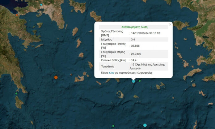 Ασθενής σεισμική δόνηση μεγέθους 3,4 βαθμών της κλίμακας Ρίχτερ, σύμφωνα με την αναθεωρημένη λύση του Γεωδυναμικού Ινστιτούτου του Αστεροσκοπείου Αθηνών, σημειώθηκε το πρωί της Παρασκευής (14/11) στις 06:39 σε υποθαλάσσια περιοχή, κοντά σε Σαντορίνη και Αμοργό.