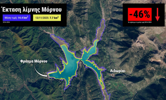Στο Παρατηρητήριο Μόρνου αναρτήθηκε την Πέμπτη 13 Νοεμβρίου η πιο πρόσφατη δορυφορική φωτογραφία της τεχνητής λίμνης, αποτυπώνοντας μια ακόμη μείωση στην έκτασή της.