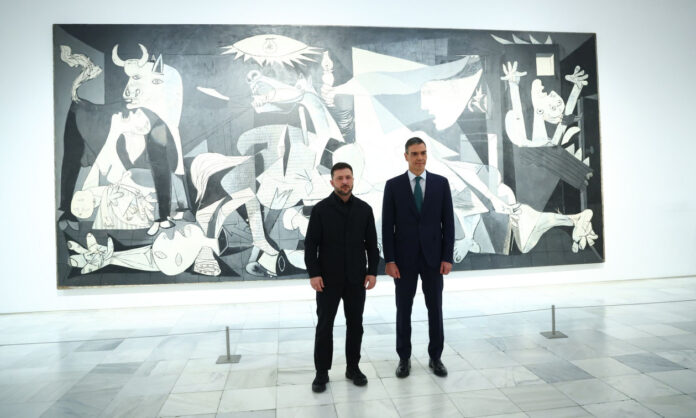 Πριν από τη διμερή συνάντησή τους στο παλάτι Μονκλόα, την κατοικία του Ισπανού πρωθυπουργού, ο Βολοντίμιρ Ζελένσκι και ο Πέδρο Σάντσεθ είχαν πάει το απόγευμα στο Μουσείο Τέχνης Reina Sofía στο κέντρο της Μαδρίτης για να δουν την «Γκουέρνικα», τον διάσημο πίνακα του Πάμπλο Πικάσο, που έχει γίνει «παγκόσμιο σύμβολο βαρβαρότητας, πολέμου», σύμφωνα με τα λόγια του Ισπανού ηγέτη στον Ουκρανό «αγαπητό φίλο» του.