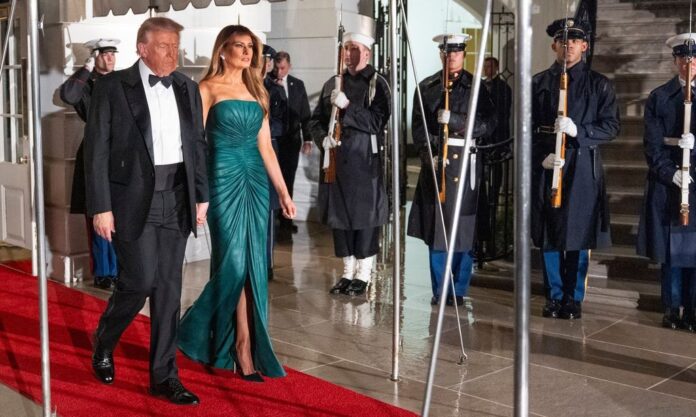 Η Πρώτη Κυρία, Μελάνια Τραμπ σε μία διακριτική όπως χαρακτηρίζεται υποστήριξη προς τον φιλοξενούμενο πρίγκιπα, εμφανίστηκε με ένα εντυπωσιακό στράπλες σμαραγδί φόρεμα, στα χρώματα της σημαίας της Σαουδικής Αραβίας, δημοιουργία του Elie Saab.