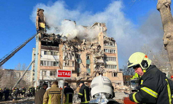 Η επίθεση προκάλεσε «σημαντική καταστροφή», είπε ο Ζελένσκι, και πολλά θύματα θάφτηκαν κάτω από τα ερείπια. Στήλες καπνού έβγαιναν από τα παράθυρα και μικρές φωτιές έκαιγαν έξω από το κτίριο.