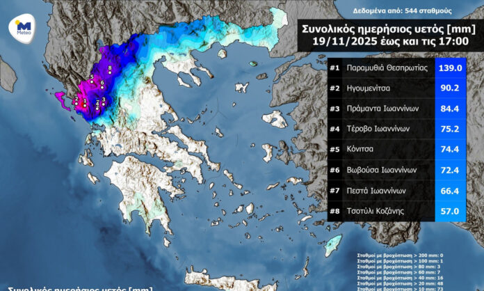 Σύμφωνα με τις καταγραφές του δικτύου αυτόματων μετεωρολογικών σταθμών του meteo.gr / Εθνικού Αστεροσκοπείου Αθηνών το μεγαλύτερο ύψος αθροιστικού υετού έως τις 17:00 καταγράφηκε στην Παραμυθιά Θεσπρωτίας και ήταν ίσο με 139 χιλιοστά.