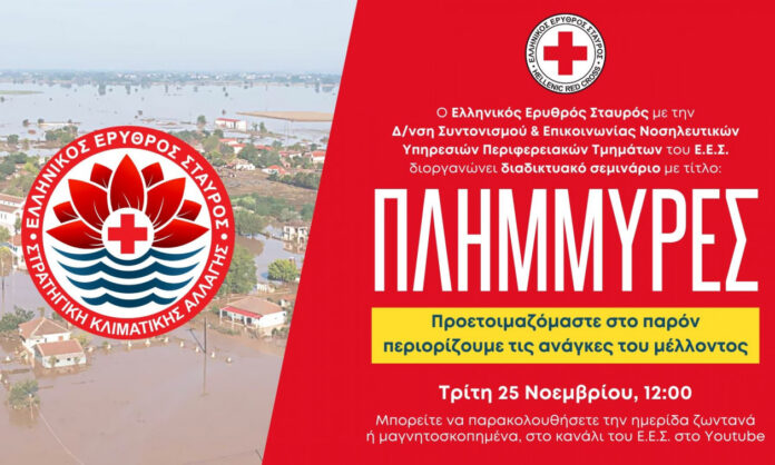 Ο Ελληνικός Ερυθρός Σταυρός (Ε.Ε.Σ.), στο πλαίσιο υλοποίησης της Στρατηγικής Κλιματικής Αλλαγής του Ε.Ε.Σ., διοργανώνει την Τρίτη 25 Νοεμβρίου 2025 και ώρα 12:00 μ.μ. διαδικτυακό σεμινάριο με θέμα: «Πλημμύρες: Προετοιμαζόμαστε στο παρόν, περιορίζουμε τις ανάγκες του μέλλοντος».