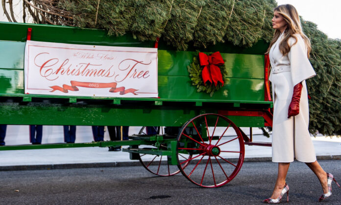 Η πρώτη κυρία των ΗΠΑ, Μελάνια Τραμπ, παραλαμβάνει το επίσημο χριστουγεννιάτικο δέντρο του Λευκού Οίκου για το 2025, τη Δευτέρα 24 Νοεμβρίου 2025, στην Ουάσινγκτον.