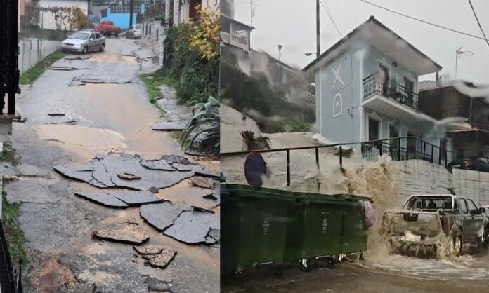 Στην Ποταμιά, στα ανατολικά του νησιού, δρόμοι μέσα στο χωριό ξηλώθηκαν ενώ πλημμύρισαν ισόγεια και αποθήκες.