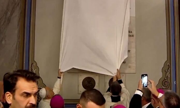 Ο ποντίφικας θα αποκάλυπτε μια μαρμάρινη επιγραφή που αναφέρεται στην επίσκεψή του στην Τουρκία, όμως το πανί αποδείχθηκε πιο «πεισματάρικο» από το αναμενόμενο.