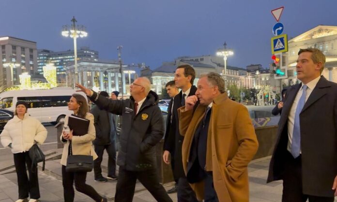 Ο Στιβ Γουίτκοφ μαζί με τον Τζάρεντ Κούσνερ μπροστά από το θέατρο Μπολσόι στη Μόσχα, την Τρίτη 2 Δεκεμβρίου 2025.