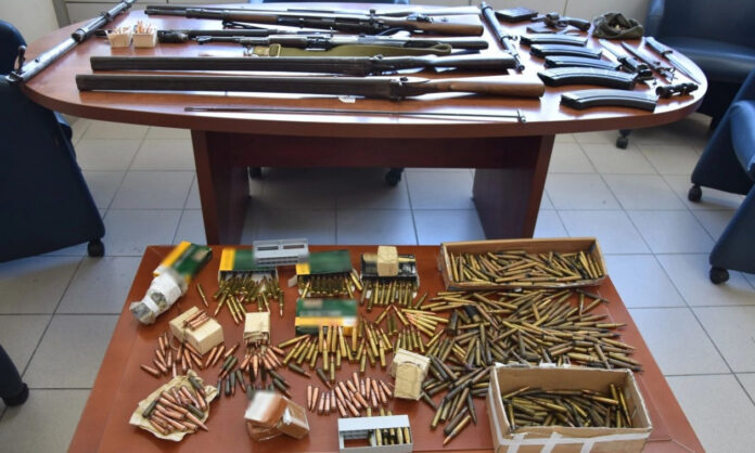 Εκεί, βρέθηκαν και κατασχέθηκαν συνολικά: 2 πολεμικά όπλα, 3 κυνηγετικά όπλα, περίστροφο, 798 φυσίγγια, 42 κάλυκες, 6 βολίδες, 3 ξιφολόγχες, 11 γεμιστήρες, κορμός πολεμικού όπλου, 2 κάννες πολεμικών όπλων, διόπτρα και διάφορα εξαρτήματα όπλων.