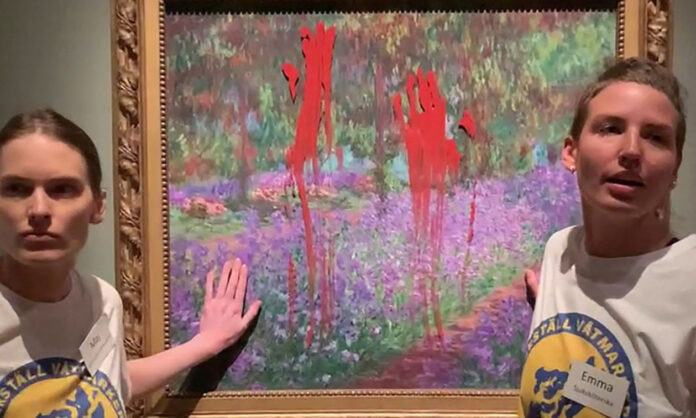 Τη 14η Ιουνίου 2023, οι δύο νεαρές γυναίκες βούτηξαν τα χέρια τους μέσα σε κόκκινη μπογιά προτού την απλώσουν στον πίνακα «Ο κήπος του καλλιτέχνη στο Ζιβερνί» (Le Jardin de l’artiste à Giverny – 1900), το οποίο είχε δανείσει εκείνη την εποχή το μουσείο Ορσέ στο εθνικό μουσείο της Σουηδίας (Nationalmuseum) στο πλαίσιο έκθεσης που ήταν αφιερωμένη στους κήπους και τη φύση.