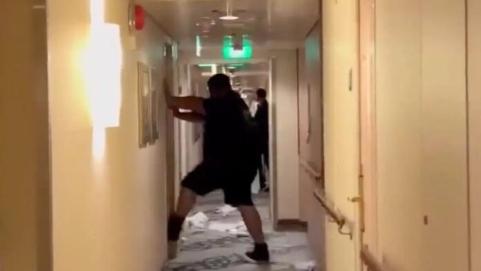Σύμφωνα με την αγωγή, όταν άφησε το μπαρ σε κατάσταση βαριάς μέθης και δεν μπορούσε να εντοπίσει την καμπίνα του, εξαγριώθηκε και άρχισε να απειλεί πλήρωμα και επιβάτες ότι θα τους σκοτώσει.