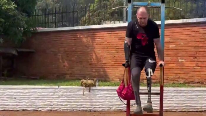 Ο 38χρονος βετεράνος πολέμων της Ρωσίας, έχει υποστεί τριπλό ακρωτηριασμό: έχει χάσει και τα δύο πόδια αλλά και το δεξί του χέρι – μετά τον σοβαρό τραυματισμό του στη μάχη του Μπαχμούτ την άνοιξη του 2023. Παρά τις βαριές του κακώσεις, στο βίντεο κάνει pull-ups, σκιαμαχεί σε σάκο, δοκιμάζει πυροβόλα όπλα και περπατά με τα προσθετικά του πόδια. Λέει πως «αν δεν μπορείς να περπατήσεις 40-50 μέτρα, δεν μπορείς να πολεμήσεις», ενώ περιγράφει την ανάρρωσή του: «Τραυματίστηκα σοβαρά, αλλά ανάρρωσα φυσιολογικά. Χρειάστηκαν τέσσερις ακόμη επεμβάσεις στον λαιμό. Μετά από έξι μήνες μου έβαλαν τα προσθετικά το 2023».