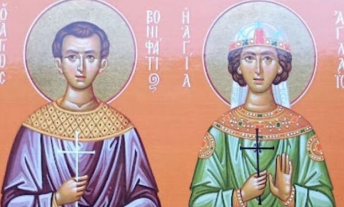 Η Αγία Αγλαΐα και ο Άγιος Βονιφάτιος έζησαν τον 3ο μ.Χ. αιώνα. Η Αγλαΐα ανήκε στην τάξη των ευγενών και πλούσιων Ρωμαίων γυναικών και ήταν πάντα πρόθυμη στις ελεημοσύνες και στις διάφορες αγαθοεργίες. Ο δε Βονιφάτιος ήταν γραμματέας της περιουσίας της Αγλαΐας και επόπτης των κτημάτων της. Όπως η κυρία του, ήταν και αυτός εύσπλαχνος και φιλάνθρωπος. Διαχειριζόταν την περιουσία της Αγλαΐας με πολλή τιμιότητα, και απέναντι στους υπηρέτες ήταν ευγενέστατος.