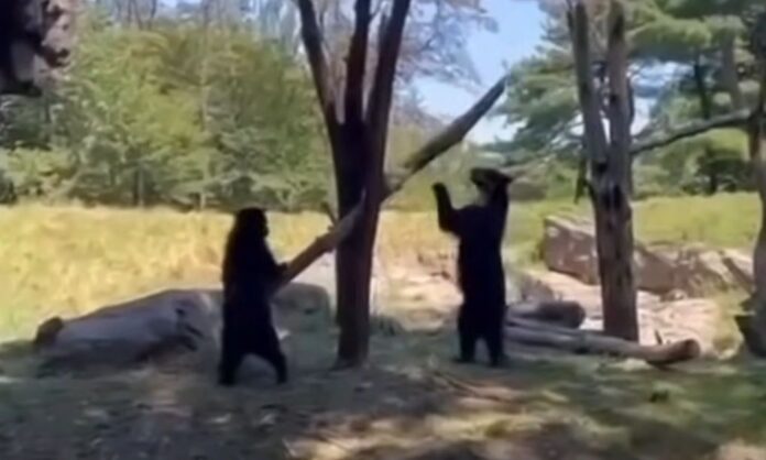 Το βίντεο που κατέγραψε επισκέπτης του ζωολογικού κήπου, δείχνει τις αρκούδες να βρίσκουν ένα μεγάλο κλαδί και να το μετατρέπουν σε… αυτοσχέδια τραμπάλα, παίζοντας και ισορροπώντας με παιδική περιέργεια.